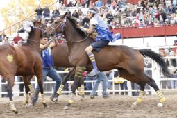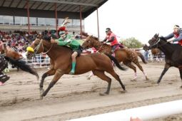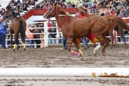 This is how racing works in the Canadian Indian Relay Race — each team has a collaboration of 3 horses and 1 rider, 1 catcher, 1 exchange holder and 1 back holder. At the start of the race, the rider will have both feet on ground while catcher holds horse. The rest of the teams will be in designated boxes located in front of the grandstand. The start will be at the sound of a horn and the rider will climb aboard horse and begin racing around the track. The horse and rider will complete one round of track. The rider will ride to designated box where the catcher stops the horse and rider dismounts — where he mounts horse number 2 — held by exchange holder and races and again around track. The rider will ride horse number 2 to designated team box where catcher stops the horse, the rider dismounts, and mounts the final horse number 3 and races around track one final time. Extreme Ciaos! Excitement! Pure skill, horsemanship and guts!! The timed winner is declared by fastest time after judges submit timesheets and penalties assessed.