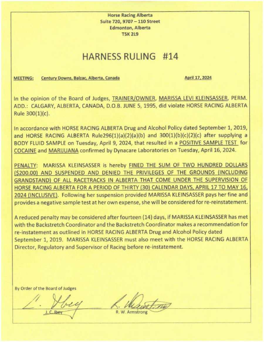 - Judgement: Fined $200, suspended all priviledges for 30 days, provide negative sample at own expense for re-instatement