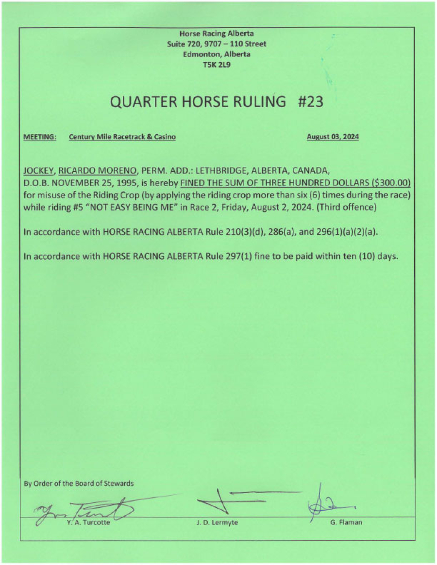 - Infraction: Misuse of riding crop (more than 6 applications)