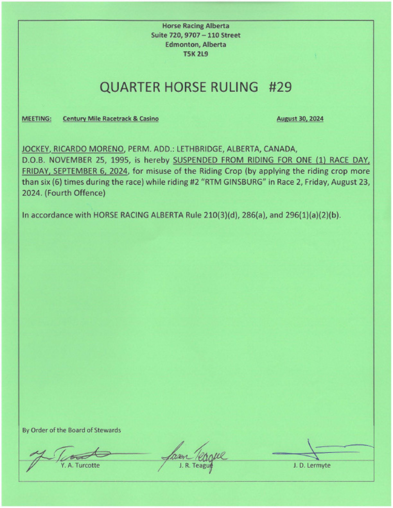 - Infraction: Misuse of riding crop (more than 6 applications)