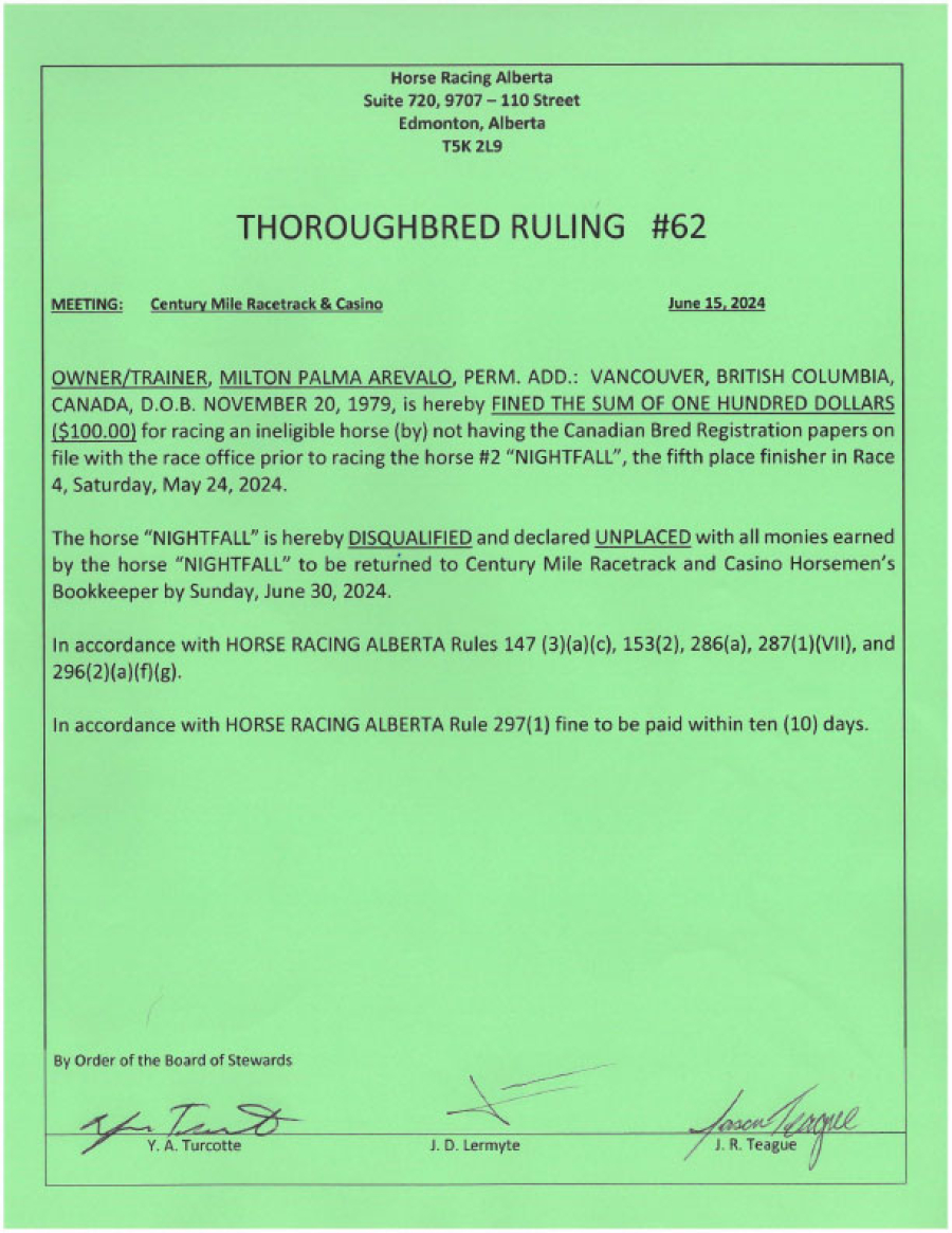 - Infraction: Racing an ineligible horse (registration papers not on file)