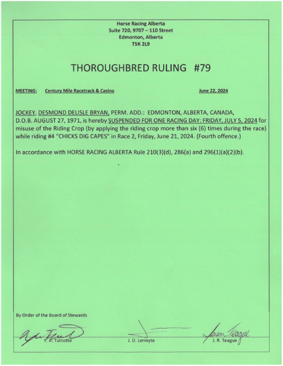 - Judgement: Suspended from riding for 1 day (4th offence)