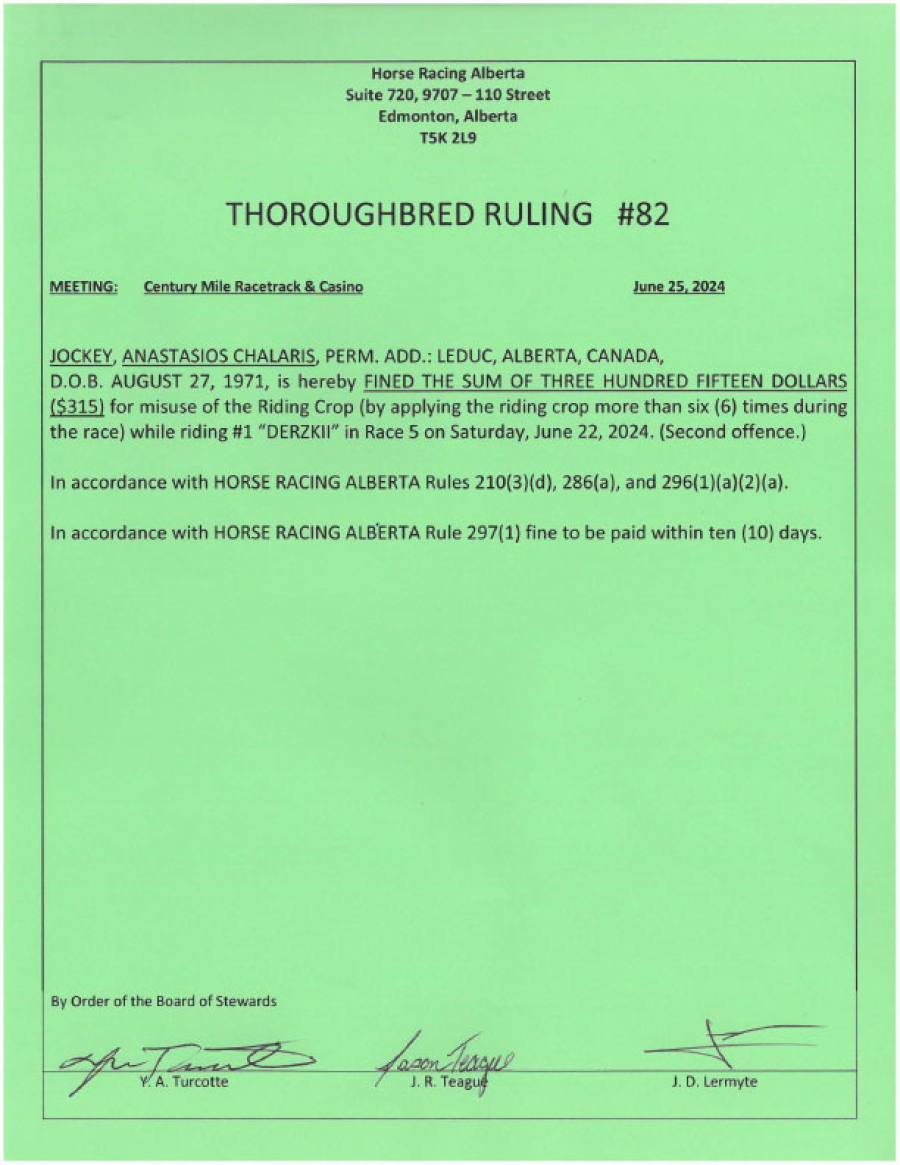 - Infraction: Misuse of riding crop (more than 6 applications)
