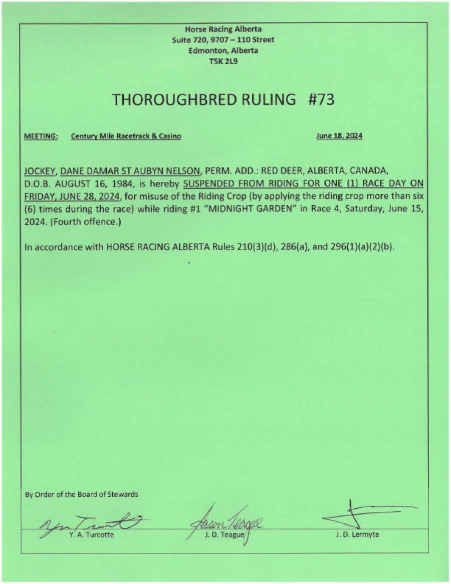 - Judgement: Suspended from riding for 1 day (4th offence)