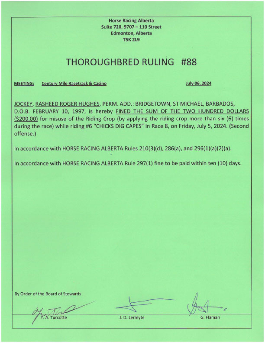 - Infraction: Misuse of riding crop (more than 6 applications)