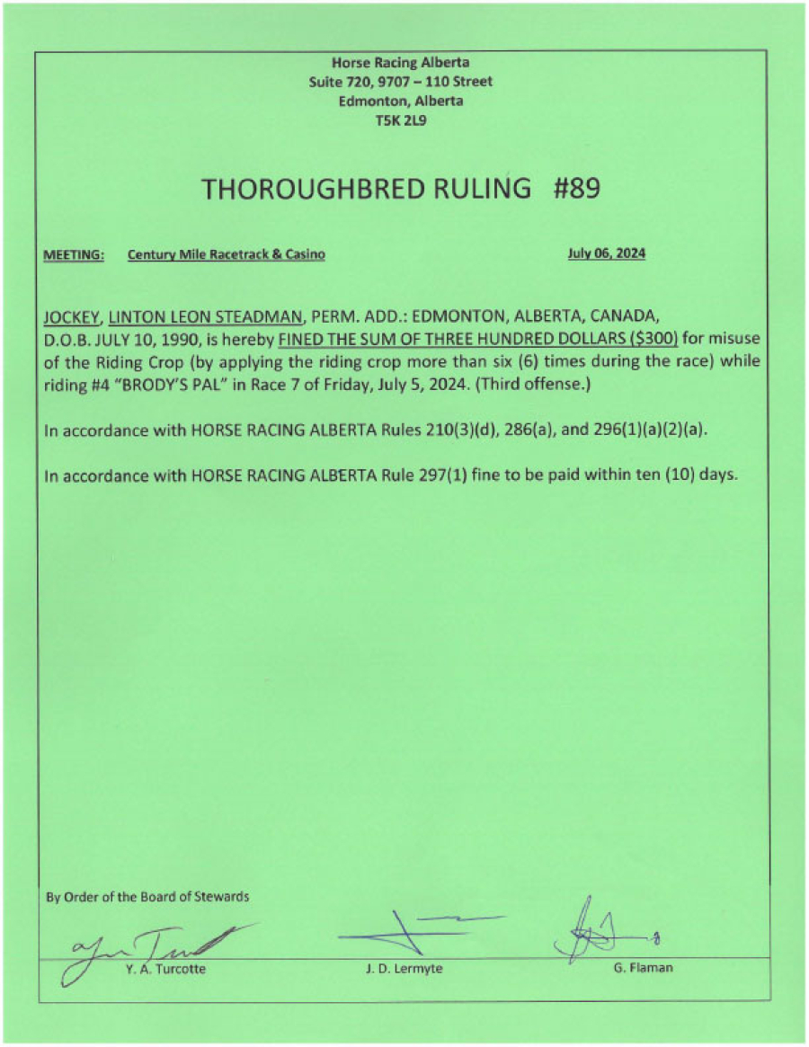 - Infraction: Misuse of riding crop (more than 6 applications)