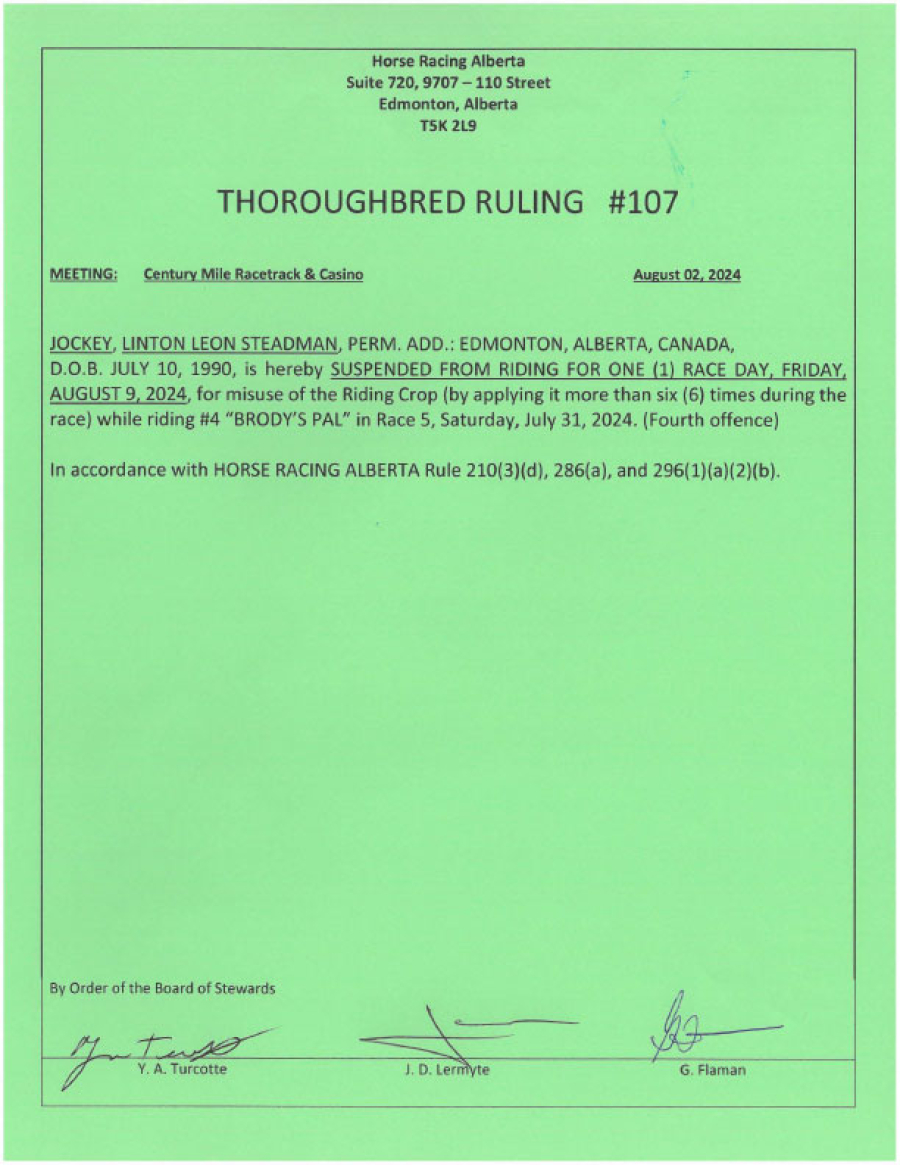 - Judgement: Suspended from riding for 1 day (4th offence)