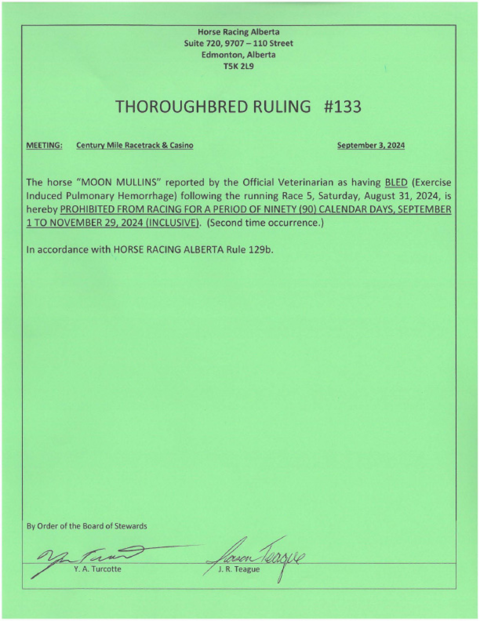 - Infraction: Diagnosed as having bled (EIPH) - 2nd occurance