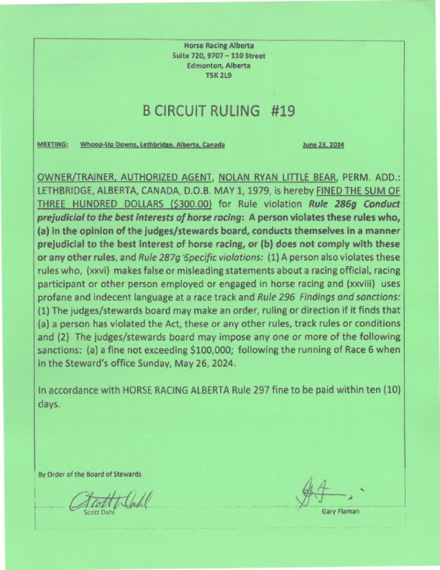 - Infraction: Conduct prejudicial to horse racing, unprofessional conduct towards a Racing Official