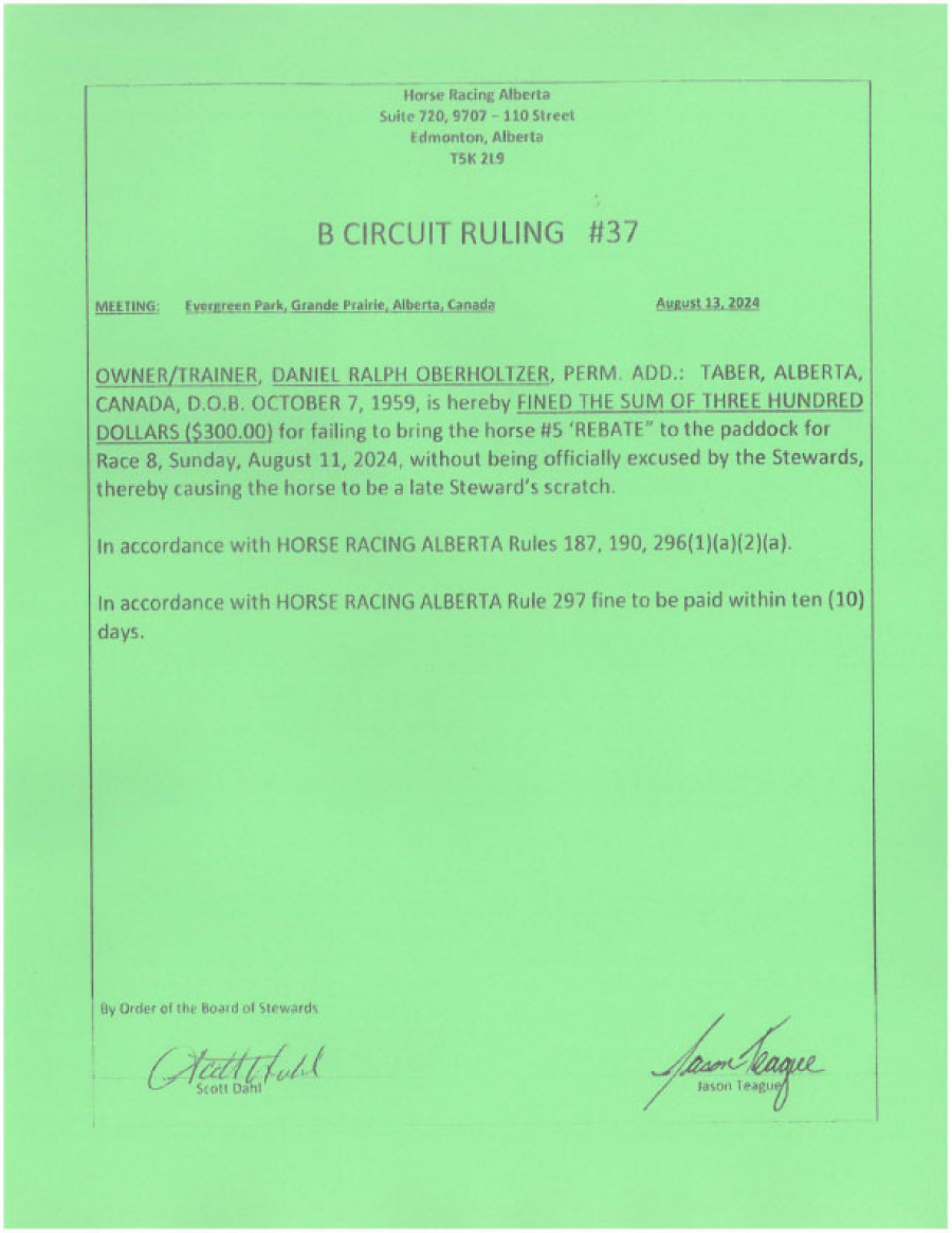 - Infraction: Fail to bring horse to paddock without being officially excused