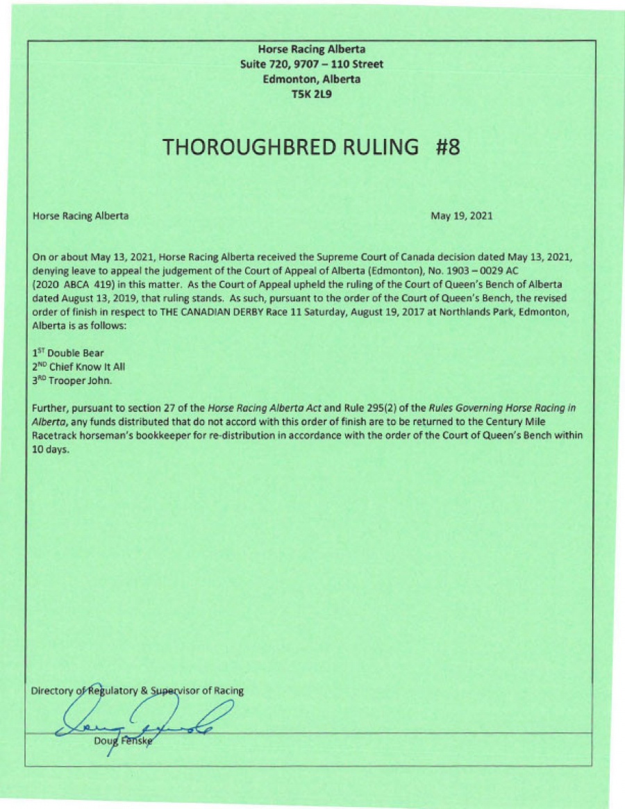 Alberta Court of Appeal ruling on 2017 Canadian Derby