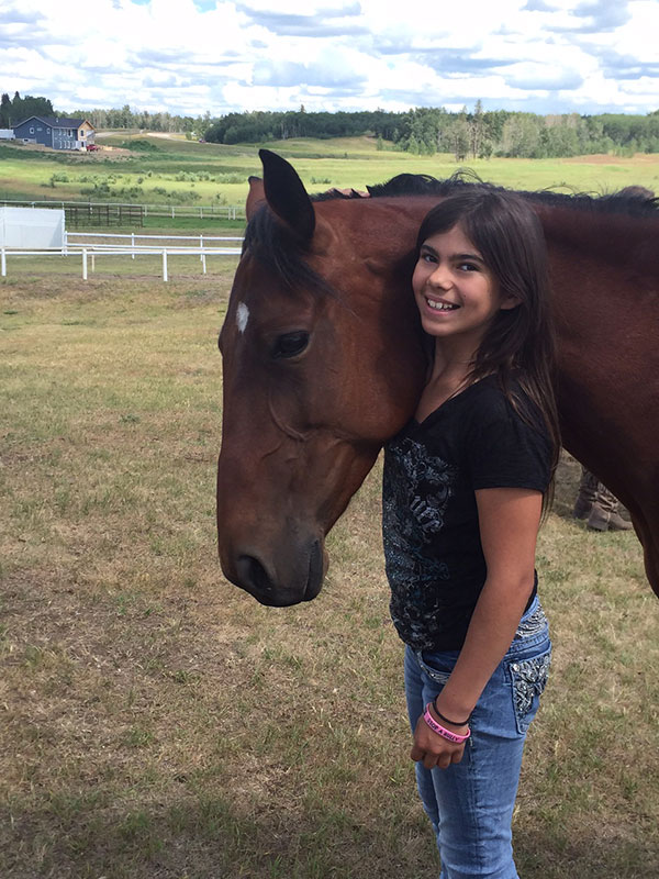Christina’s daughter Aleshia Shaw is 15, and is devoted to Buddy. Standardbreds in Alberta are pacers, and retraining a pacer to walk, trot and canter can take a daunting number of hours and for an older horse it can take years - Aleshia has happily accepted the challenge. Aleshia always loved Buddy when he was in their racing stable’s barn, and with her younger sister would hang off the bars on the stall and slip onto his back as often as they could. He was as patient with the girls as was tenacious at the track, and with his extra long tongue that he lolls out at every opportunity and need to be part of every activity in the barn he worked his way into their hearts.