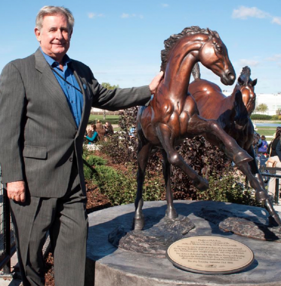 This statue is dedicated by the Alberta Horse Racing and Breeding Industry to the Honorable Ralph Klein, in appreciation of his efforts and