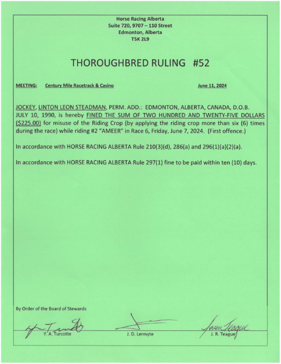 - Infraction: Misuse of riding crop (more than 6 applications)