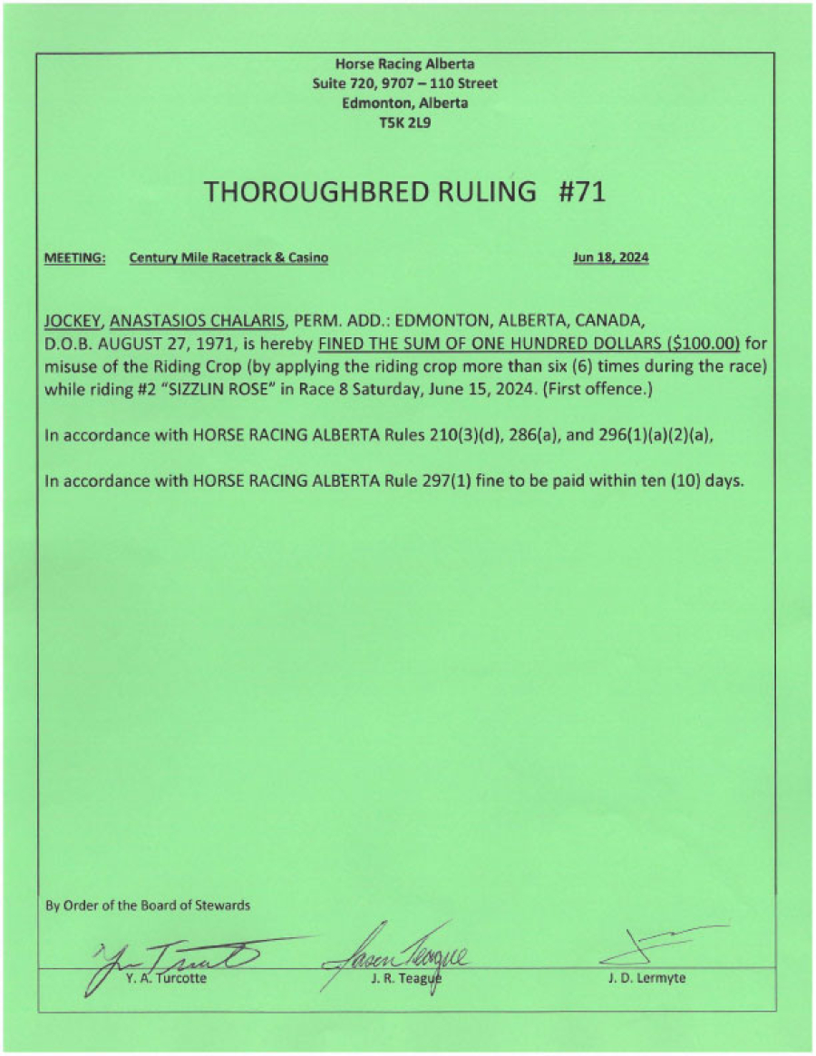 - Infraction: Misuse of riding crop (more than 6 applications)