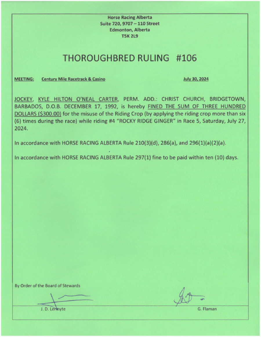 - Infraction: Misuse of riding crop (more than 6 applications)